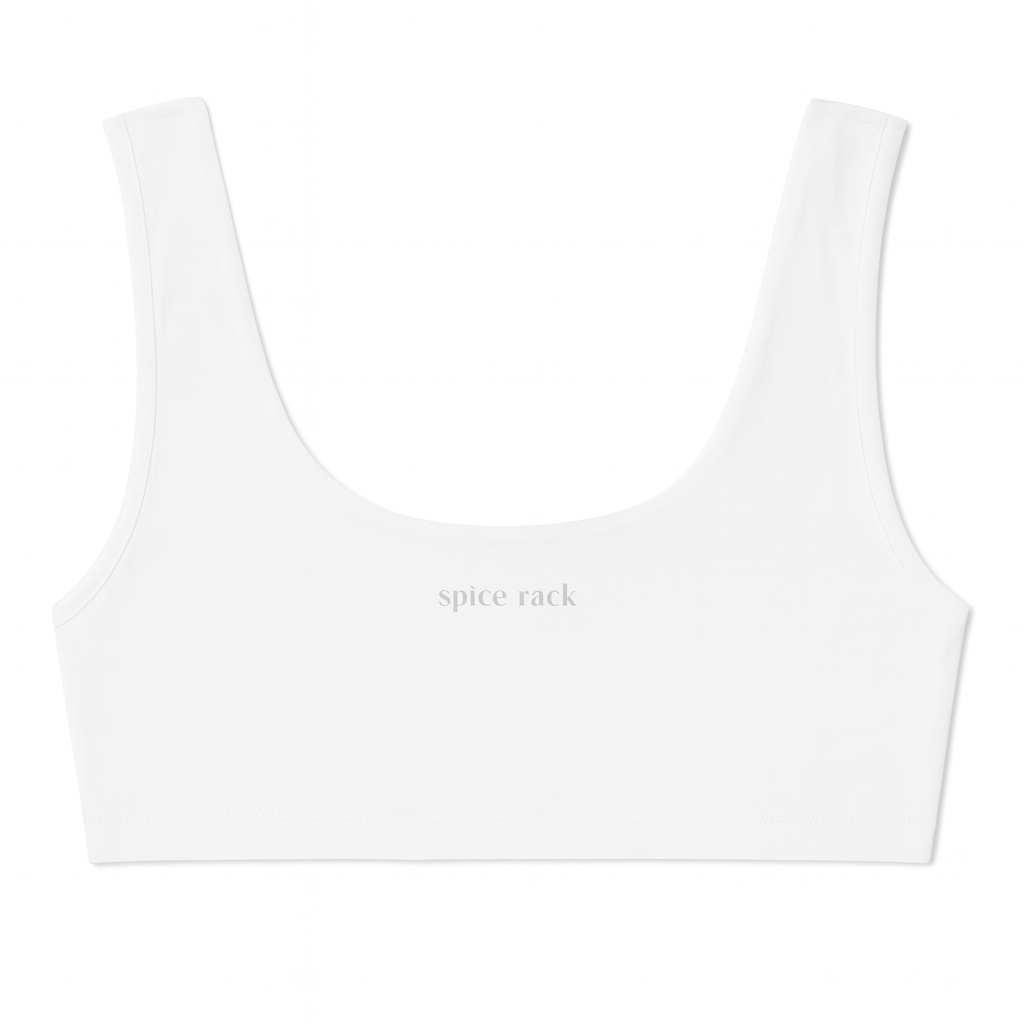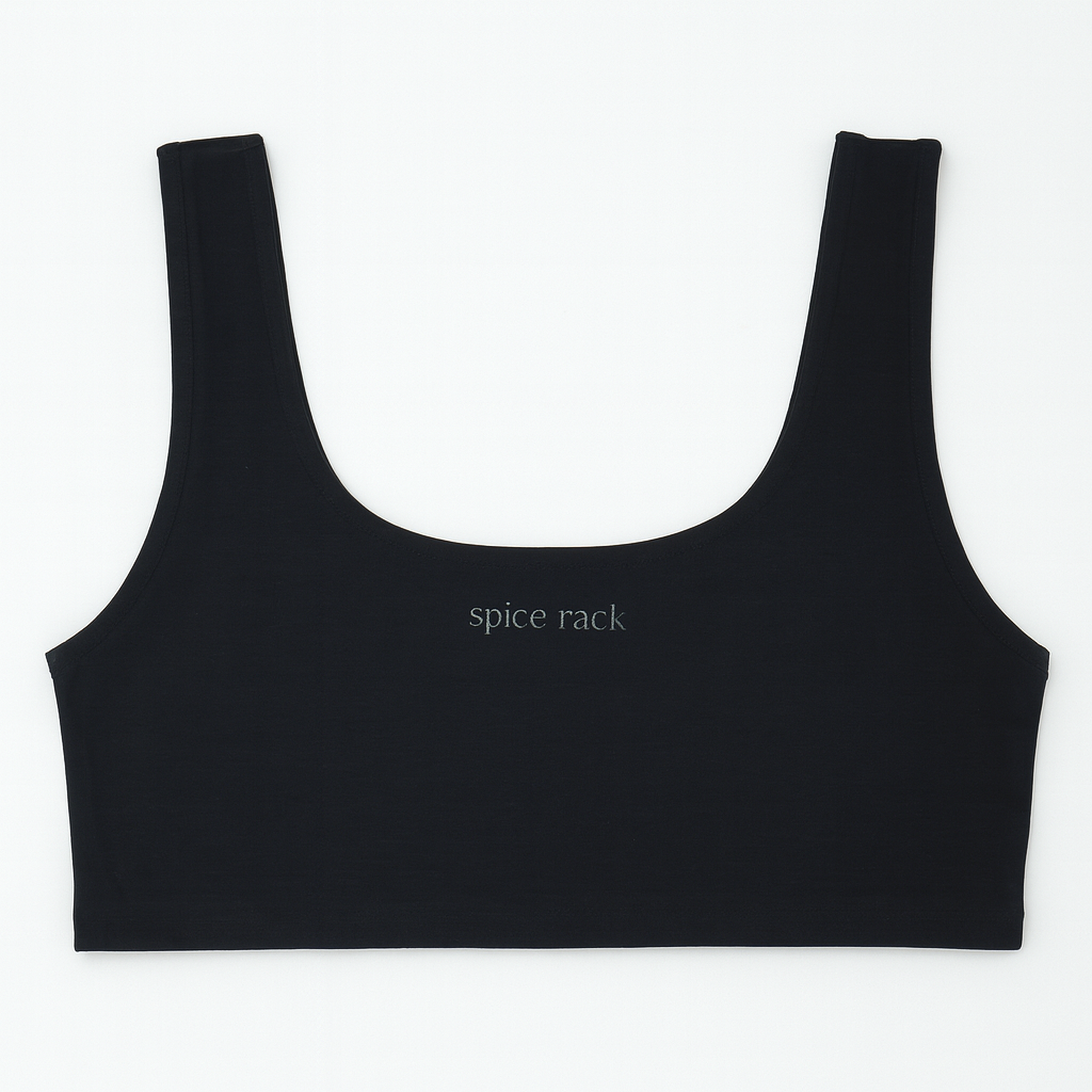 Cindy Scoop Bralette- Ultimate comfort. This stylish crop bra has a clean finish neckline, wide straps. Spice Rack monochromatic logo.